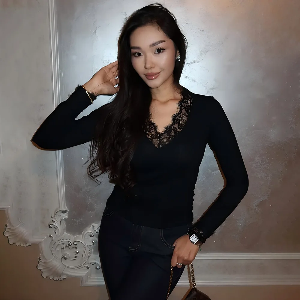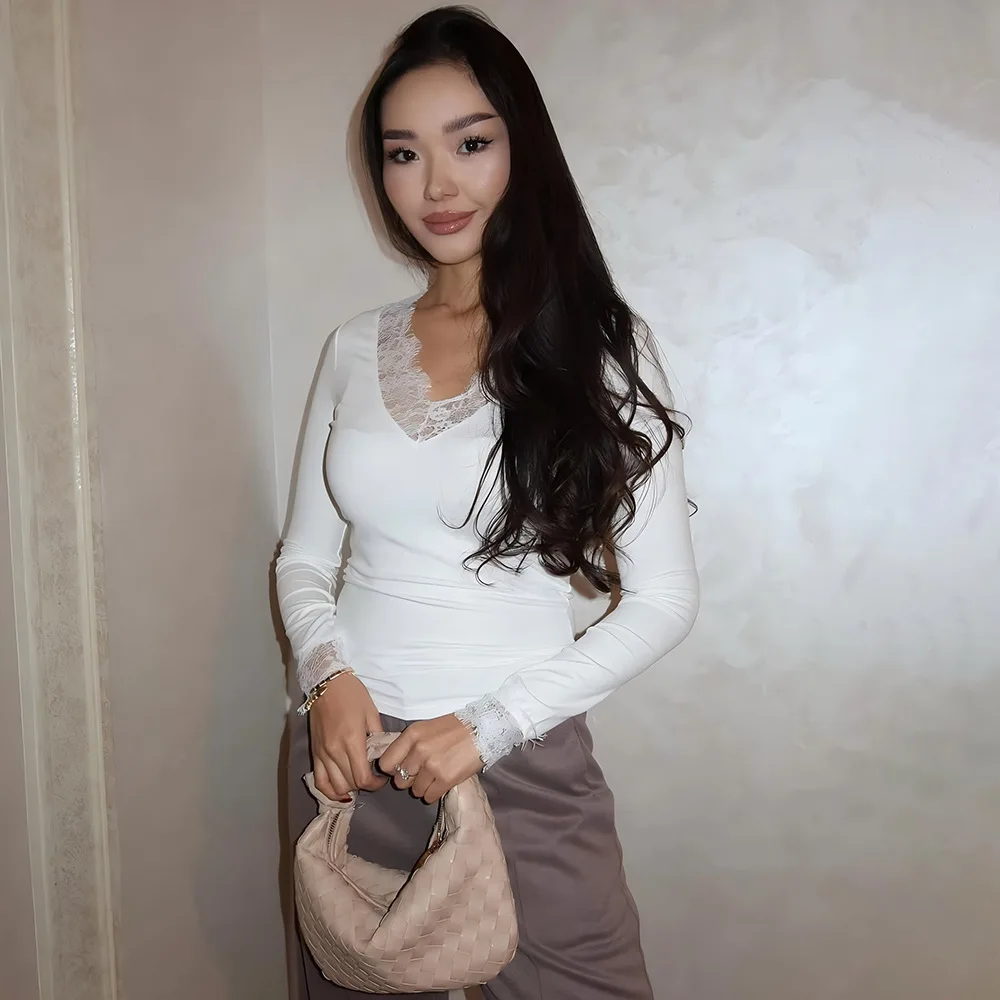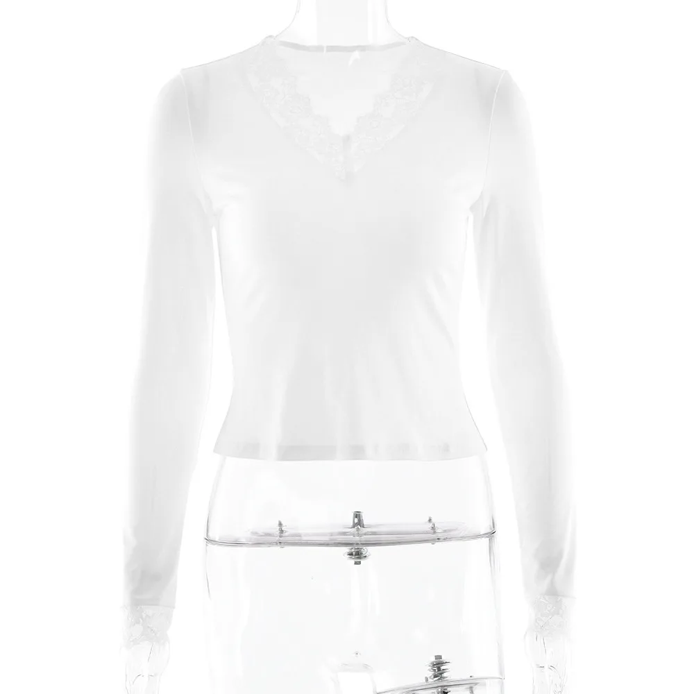Sexy V-Neck Lace Trim Long Sleeve T-Shirt Women'S Slim Fit Inner Wear Strap Design Cross-Border Style Street Fashion Trend