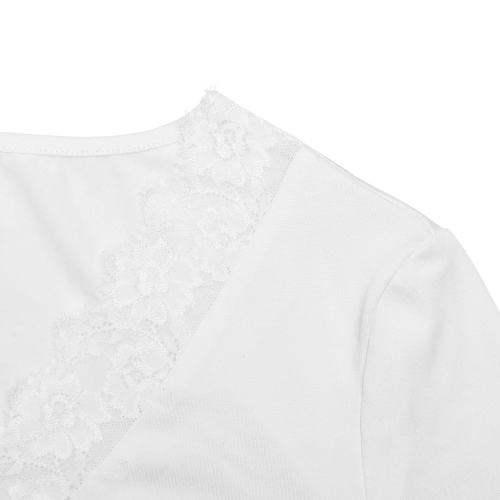This T-shirt features a stylish V-neck design with lace trim, adding a touch of elegance and femininity to your outfit.